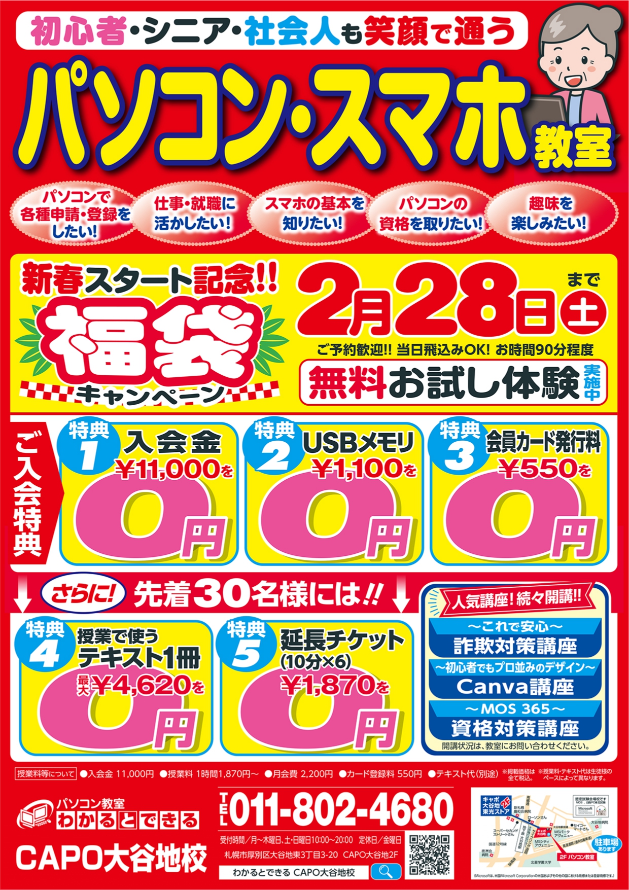 newsパソコン・スマホ“新春スタート記念!!福袋キャンペーン”〈ご入会特典〉 入会金・USBメモリー・会員カード 0円 ※2月28日(土)まで 無料お試し体験実施中!わかるとできるキャポ大谷地校2025.12.24