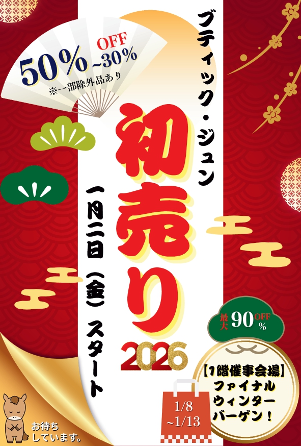 news初売りセールブティックジュンでは1月2日から初売りをスタートいたします! 最大50~30%オフと大変お買い得! お買い得なこの機会にぜひお買い物にいらしてくださいね♪ ※一部除外品ありBoutique JUN2025.12.07 -